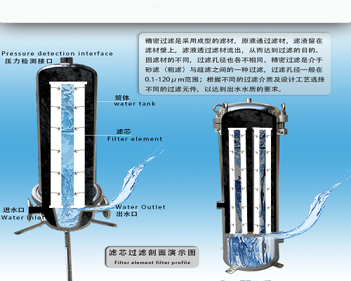 多芯精密過(guò)濾器是一種常見(jiàn)的過(guò)濾設備,可以用來(lái)過(guò)濾原水中殘存的微量懸浮顆粒、膠體、微生物等,隨著(zhù)制水時(shí)間的增長(cháng),濾芯因截留物的污染,其運行阻力逐漸上升,當運行至進(jìn)出口水壓差達0.1MPa時(shí),應更換濾芯。多芯精密過(guò)濾器采用成型的濾材,在壓力的作用下,使原液通過(guò)濾材,濾渣留在管壁上,濾液透過(guò)濾材流出,最終達到過(guò)濾的目的。